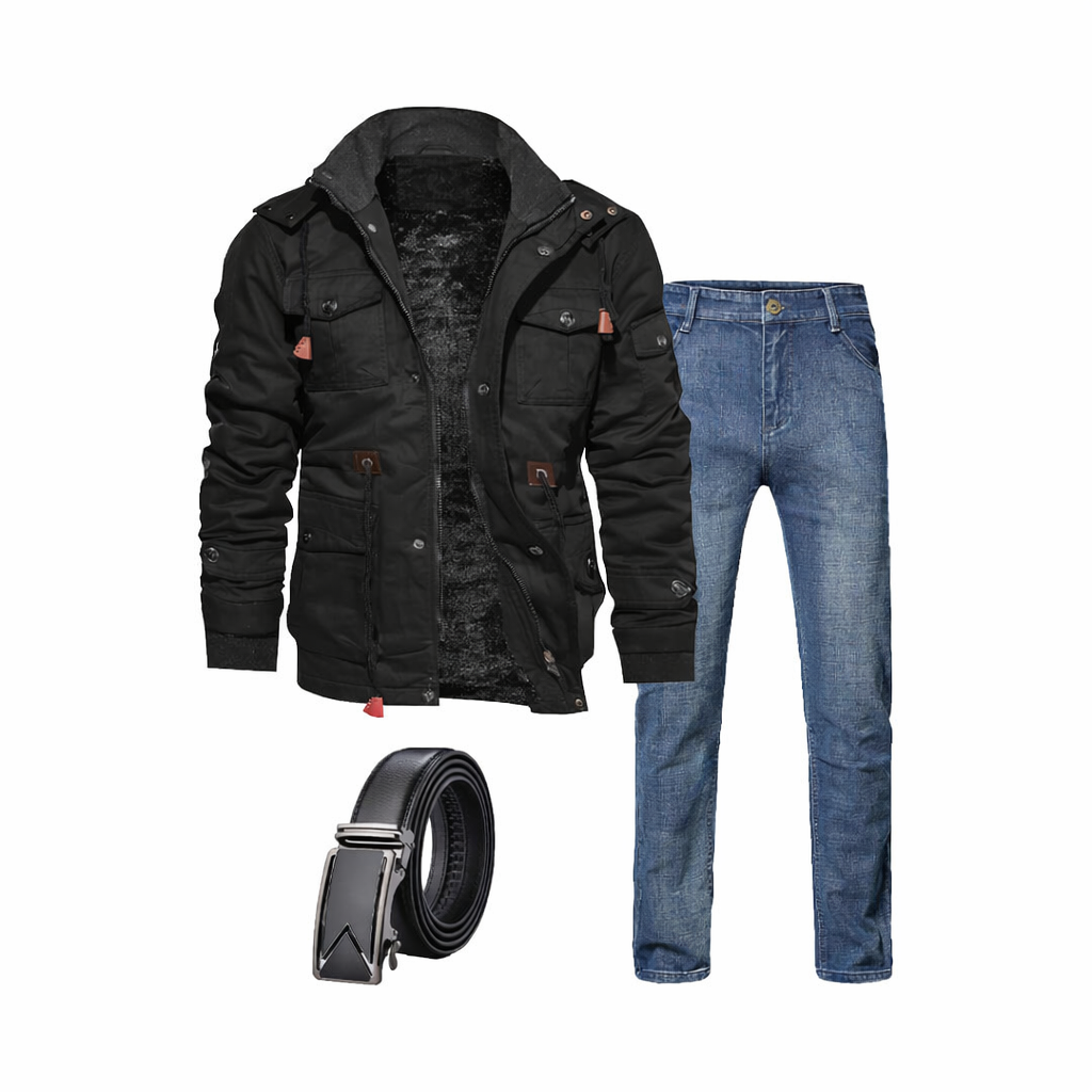 La chamarra táctica negra ofrece durabilidad y protección para el uso diario, los jeans en tono azul clásico brindan estructura y comodidad, mientras el cinturón premium aporta el toque final elegante y práctico. Es un paquete ideal para quienes quieren un look fuerte, confiable y fácil de combinar.