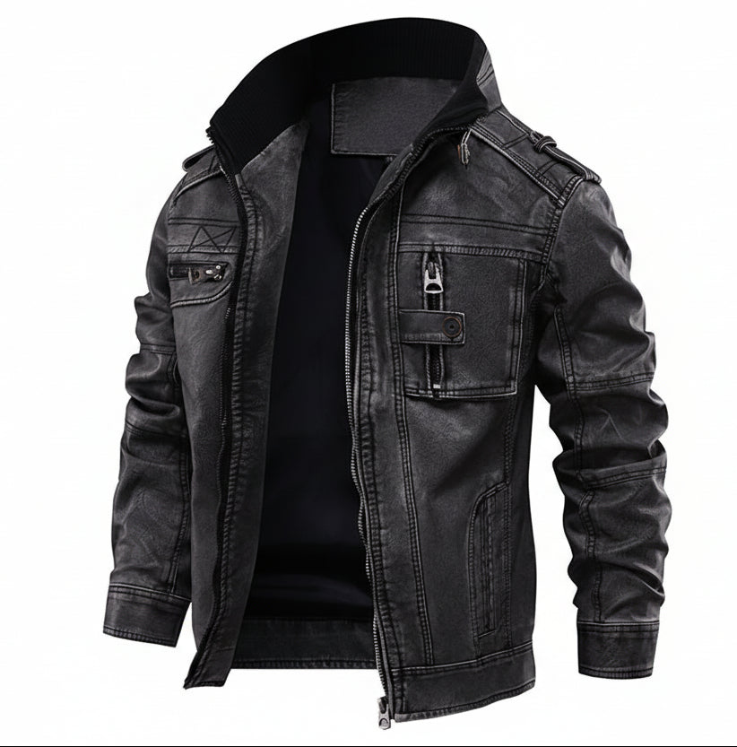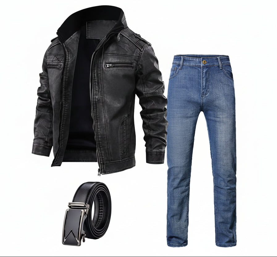 La chamarra negra aporta una presencia fuerte y un estilo urbano clásico, los jeans en azul royal ofrecen estructura y comodidad para el uso diario, mientras el cinturón premium completa el conjunto con un toque elegante y práctico. Es un paquete pensado para crear outfits seguros, modernos y fáciles de combinar.